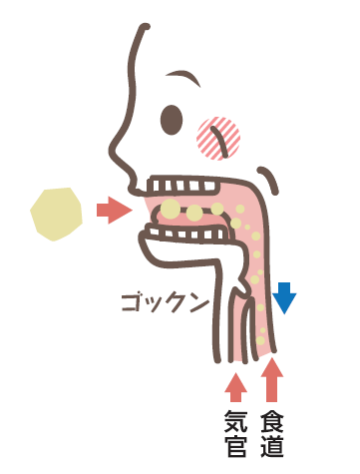 私たちの喉には、息をするために常に開いている「気管」と食べ物を飲み込むときに開く「気道」の二つの出口があります。飲み込むときは、気管を閉じて、食道を開き、食べ物を押し込みます。この動作をタイミングよく行う必要があります。