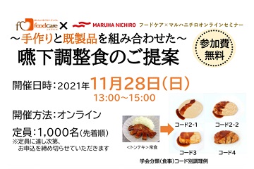 本セミナーでは、株式会社フードケアとマルハニチロ株式会社の共催にて、手作りと既製品を組み合わせた嚥下調整食の調理方法について、実演を中心に各コードの調理方法をご紹介いたします。