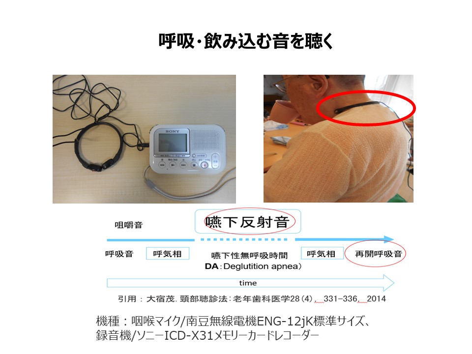 食事形態が適切かどうか観察だけでは難しい場合は、食事中の摂食嚥下機能の確認に咽喉マイク(写真①; 機種:咽喉マイク/南豆無線電機ENG-12jK標準サイズ、録音機/ソニーICD-X31メモリーカードレコーダー)を活用しています。咽喉マイクは、要介護高齢者においても安全に検査が可能で、日常の食事の場面で簡便に実施できます。咽喉マイク導入後、誤嚥の有無、及び咽頭運動の開始と終了を特定することができます。摂食嚥下機能評価は、検査内容により至近距離で実施する項目があります。感染流行期では特に飛沫曝露を避けなければなりません。感染対策の上でも、利用者と距離を保ち評価ができる咽喉マイクは、支援者側も安心して評価を実施できます。