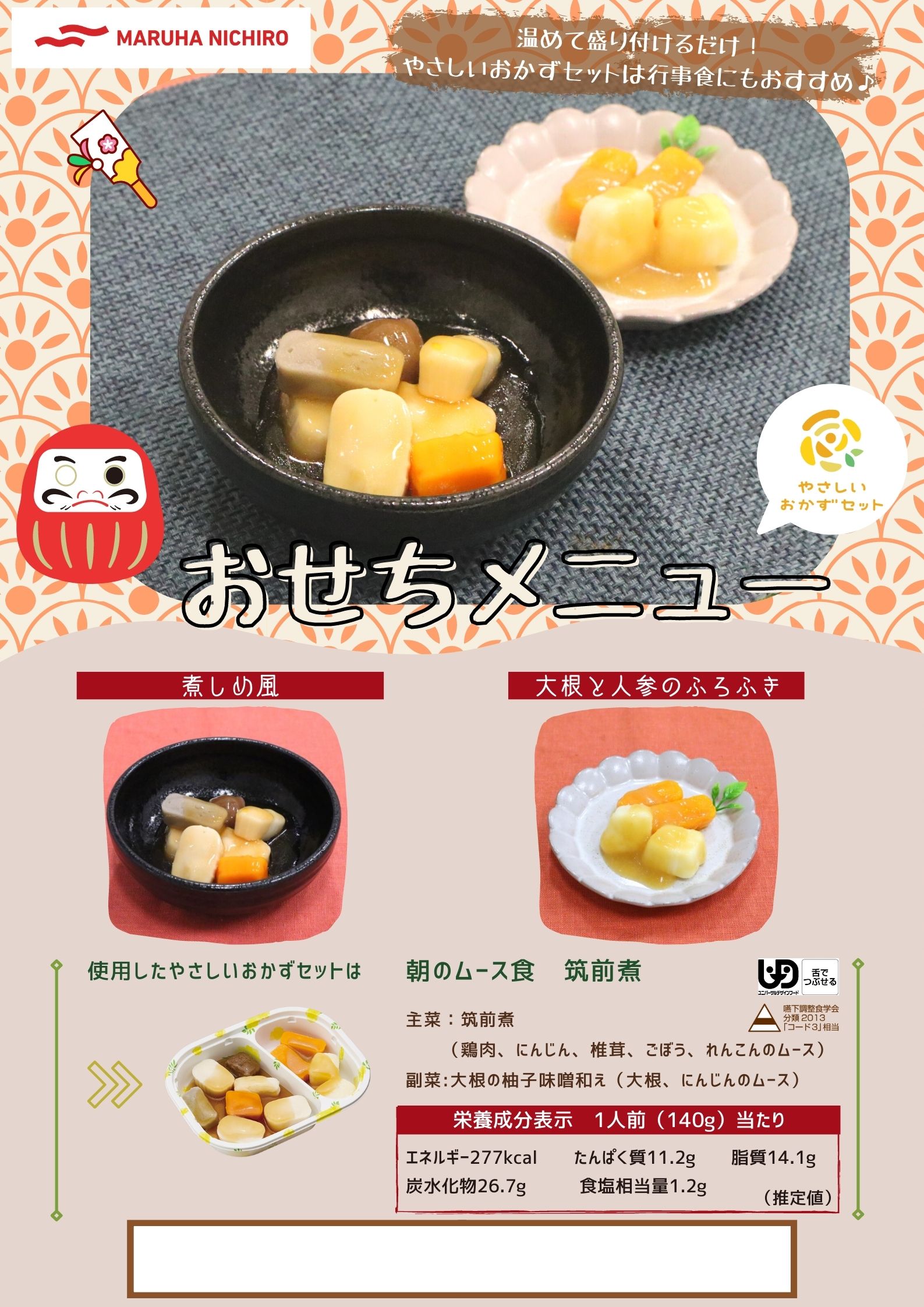 味付け済みで、スチコンや電子レンジで温めてお召し上がりいただける「やさしいおかずセット」の中から、おせちメニューにおすすめの商品を2品、ご紹介いたします。