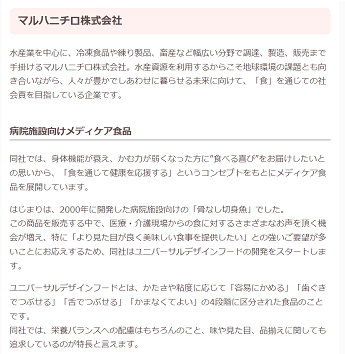 看護師さん向けお役立ち情報を発信されている「看護のお仕事」というサイトで、「安心安全な医療現場の環境整備や嚥下食づくりに貢献する企業」としてマルハニチロ(株)のメディケア食品をご紹介いただきました。