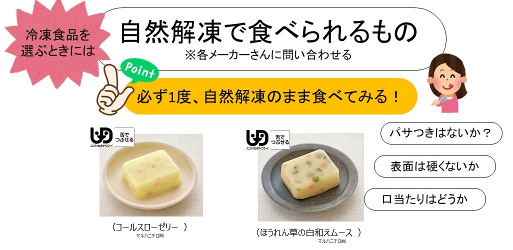 味だけでなく、嚥下機能に対しての配慮も必要です。自然解凍で食べられるUDFの冷凍食品の場合は自然解凍してどんな食感なのか、硬さはどうか、などを確かめておきます。