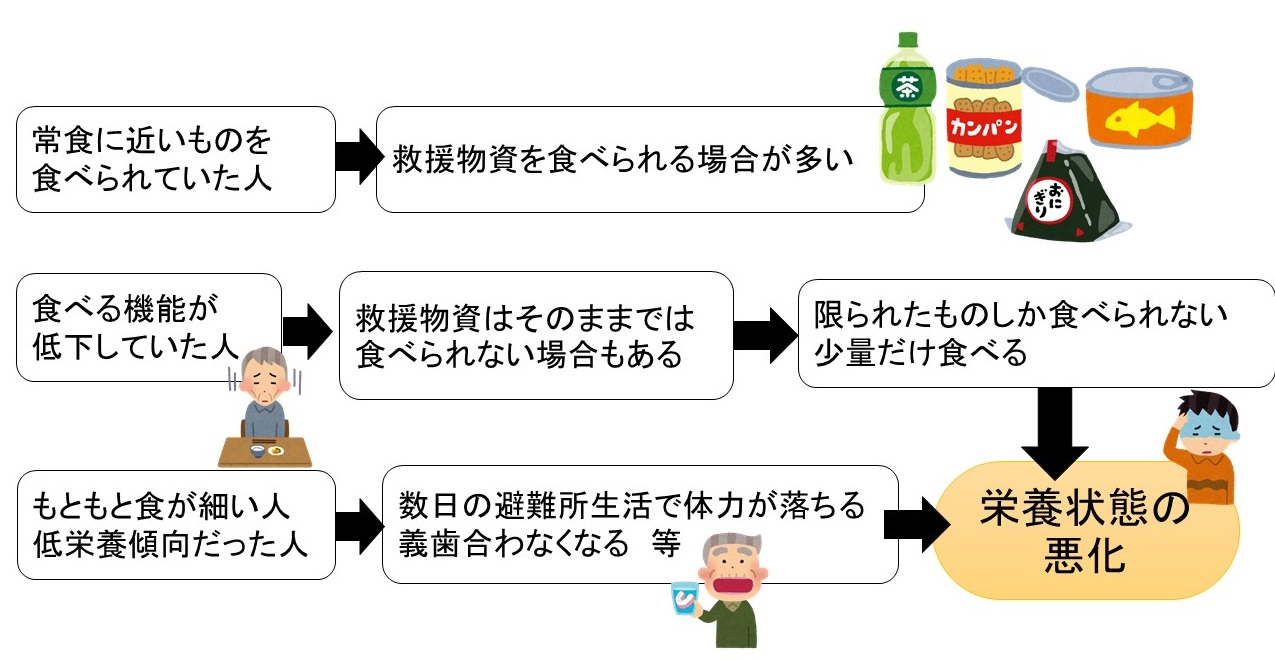 嚥下機能が低下した方はもともと食べる量が少なかったり、栄養状態が低下している方も多く、災害時に食べるものがさらに少なくなると急激に栄養状態が悪化する可能性もあります。そのため、災害時には嚥下機能が低下した方への食事の配慮が必要です。