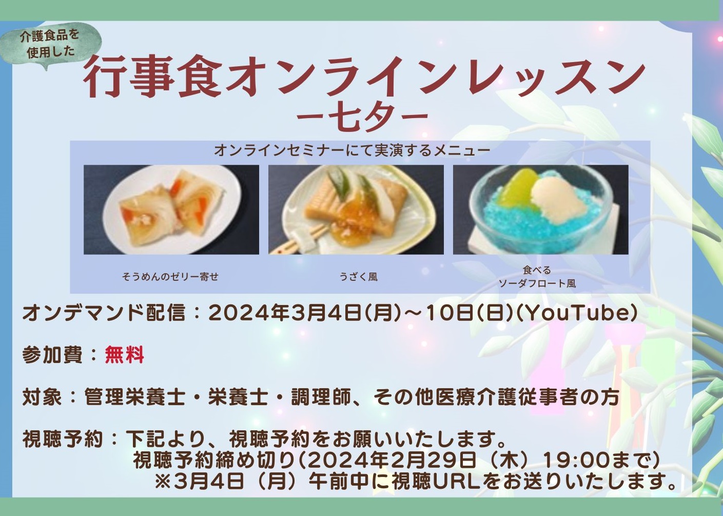 既製品介護食のレシピバリエーションにお悩みの方、七夕の行事食を検討中の方、ぜひお気軽にご参加ください!