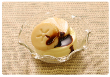 2.冷蔵解凍したSFエネケアムース35・チーズケーキ風(亜鉛・鉄)を器に盛り付け、1を添え、チョコレートシロップをかける。