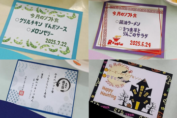 その中でも、ソフト食の患者様へは特に配慮しています。ソフト食は献立表を病棟に配布していないので、行事食の時は何が出ているかわからないのです。そこで手作りのカードを作って、何が出ているかわかるようにしています。 普段は効率を重視していますが、行事の時は見た目重視で食材を選んだり、調理工程を増やしたりして、特別感を演出しワクワクしてもらえるよう心がけています。