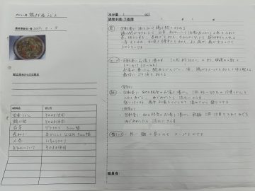 調理師さんとの連携も大切にしており、調理工程表には細かい切り方や手順、盛り付けのポイントまで書いています。調理後もコメントを記載できるようになっているので、次回の作り方の工程改善に役立てています。 新しいメニューを提供する際は、事前に調理師さんと打ち合わせを実施し、かたさが気になる場合も委員会で確認するなど、安全面にも配慮しています。