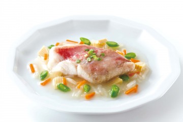 介護食品のNew素材deソフト『赤魚』は赤魚の骨を丁寧に取り除き、切り身の形をそのまま残してユニバーサルデザインフード歯ぐきでつぶせるかたさに仕上げました。素材として様々な料理にご使用いただけます。