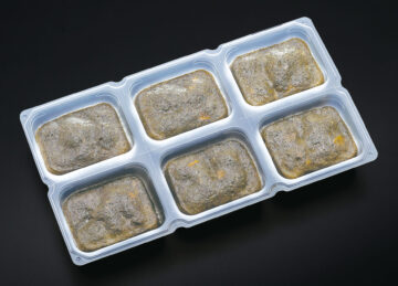 介護食品のやさしいおかず『ひじき煮ムース』はひじき煮を再現したユニバーサルデザインフードの舌でつぶせるかたさの惣菜ムースです。自然解凍、加熱調理、どちらも可能です。