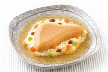 介護食品のやさしい素材『たんぱく21 さけ』はたんぱく質が100g中に21g含まれており、常食とほぼ同等のたんぱく質含有量です。さけの風味をいかした切身型のユニバーサルデザインフード舌でつぶせるかたさのムース状の商品です。