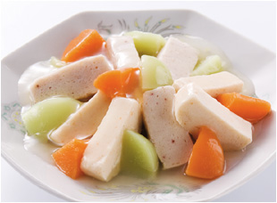 介護食品の『やさしい素材』はユニバーサルデザインフード舌でつぶせるかたさの介護食品です。