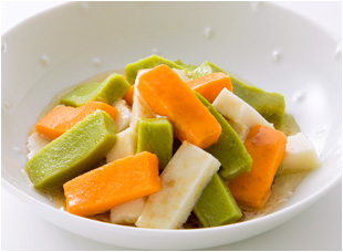 やさしい素材 温野菜れんこん、温野菜にんじん、温野菜いんげんを使用した介護食レシピをご紹介いたします。