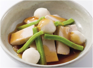 やさしい素材 いか、温野菜さといも、温野菜いんげんを使用した介護食レシピをご紹介いたします。