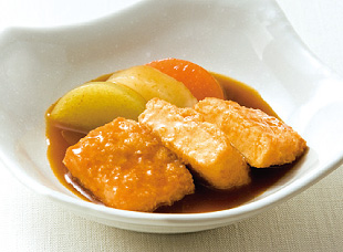 - 水、赤みそ、料理酒、砂糖、みりん、しょうゆ、塩を合わせて火にかけ、ひと煮立ちさせたら2.と3.を並べてサッと煮込み、とろみ調整食品を入れてとろみをつける。