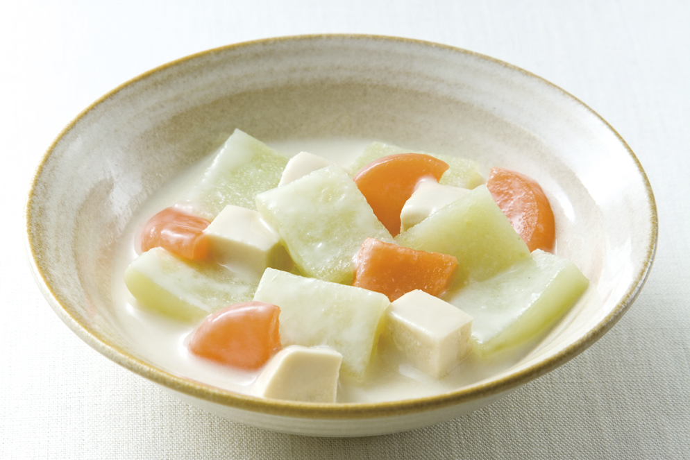 やさしい素材 チキン(ブロック)、とけないはくさい、とけないにんじんを使用した介護食レシピをご紹介いたします。