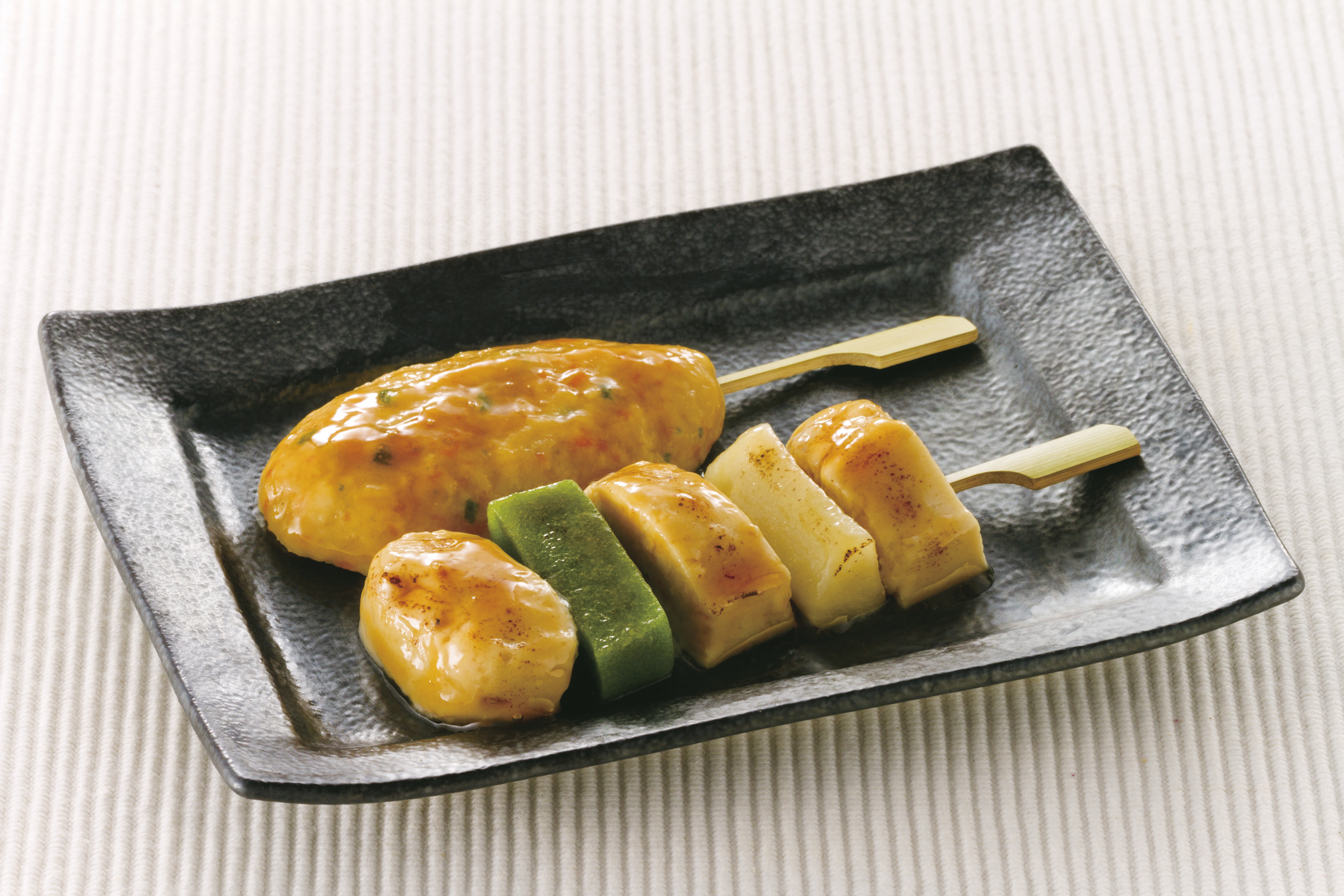- ボウルに2、チキン、溶き卵を入れて混ぜ合わせて、片栗粉を加えてかたさを調整し、細長い楕円形にまとめて蒸して串に刺す。