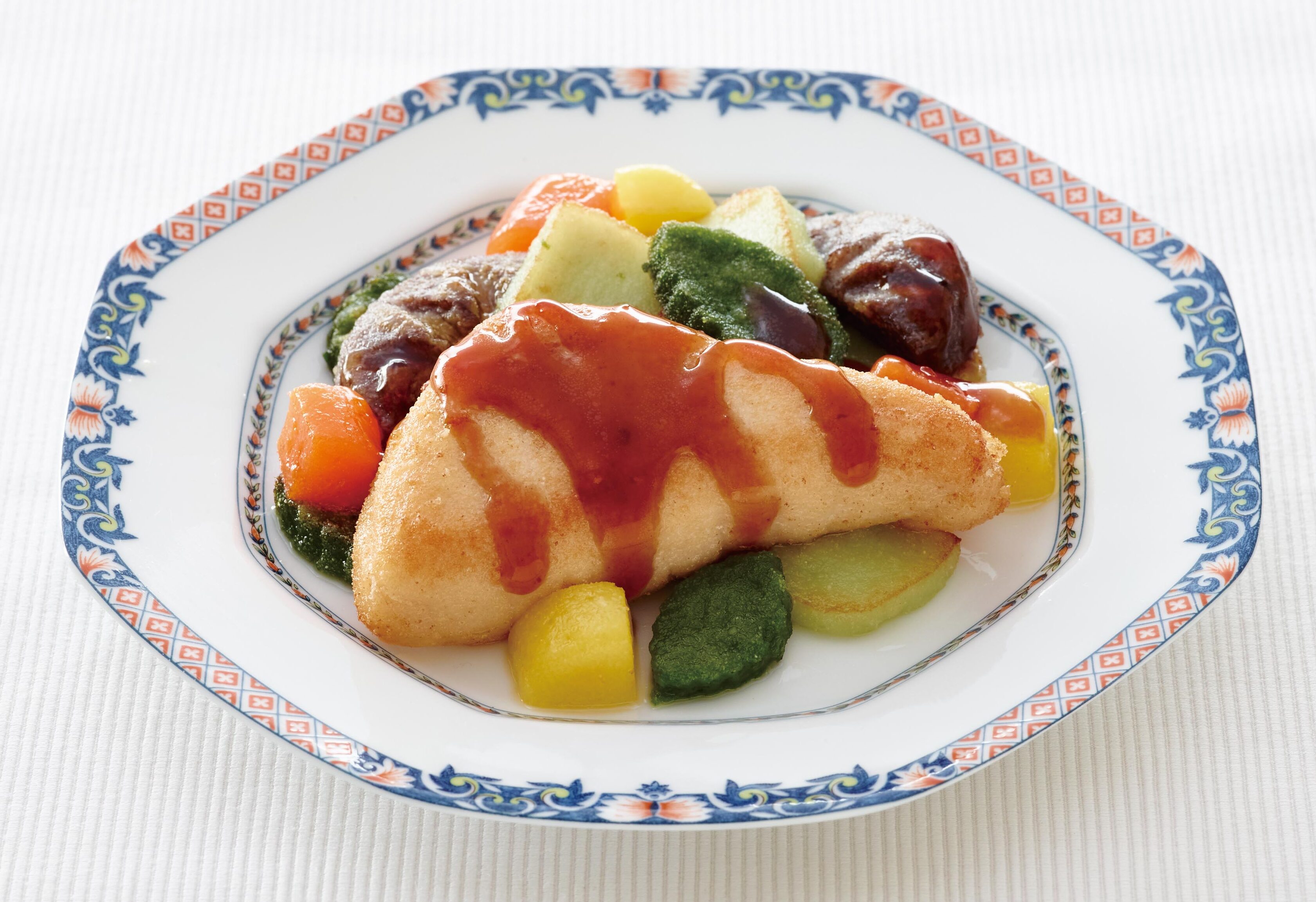 やさしい素材 たんぱく21赤魚、温野菜、とけない野菜を使用した介護食レシピをご紹介いたします。