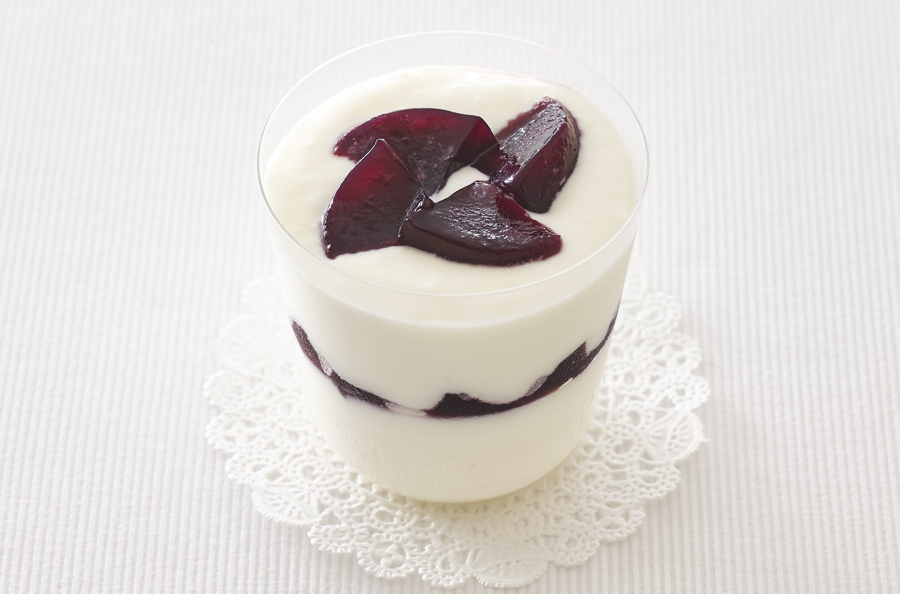 - カップに1/2量の2を入れ、赤ぶどう1/2個をカットしてのせる。