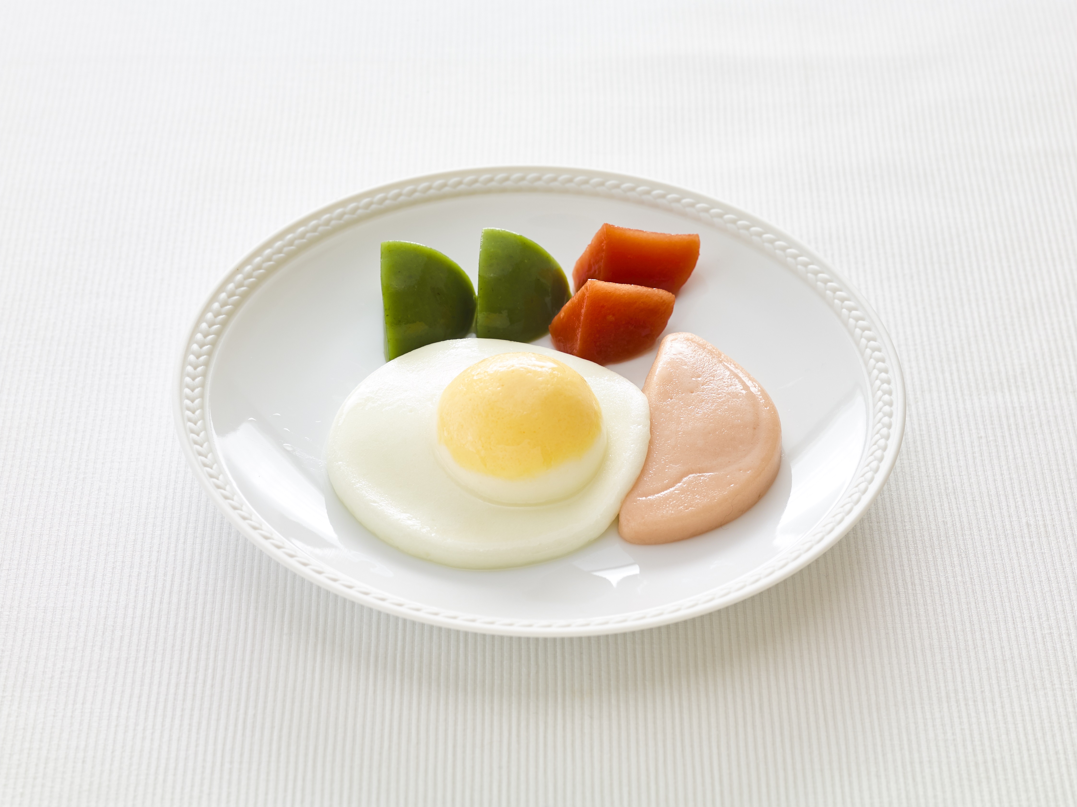 介護食品の『やさしいおかず みためが目玉焼き、みためがハム』『やさしい素材』はユニバーサルデザインフード舌でつぶせるかたさの介護食品です。