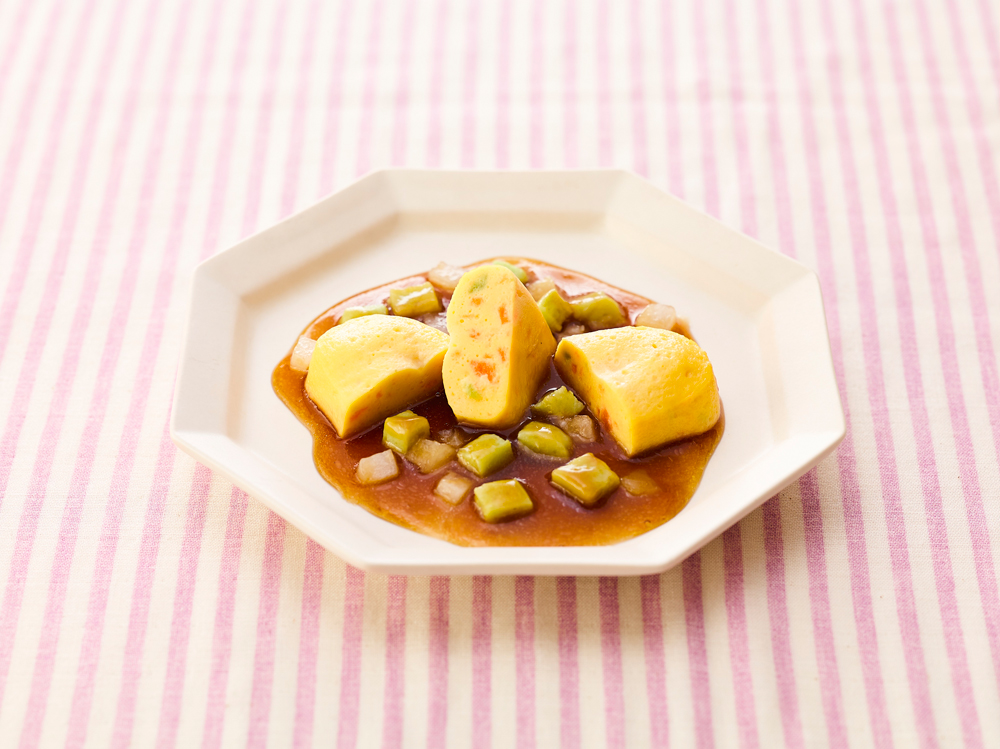 介護食品の『やさしいおかず 彩りたまごムース』『やさしい素材』はユニバーサルデザインフード舌でつぶせるかたさの介護食品です。