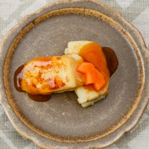 - たんぱく21ビーフ、温野菜れんこんは半解凍し、厚さ約5mmにスライスする。たんぱく21ビーフで温野菜れんこんをサンドし、表面に薄力粉をまぶす。温野菜にんじんは半解凍し、型で抜く。