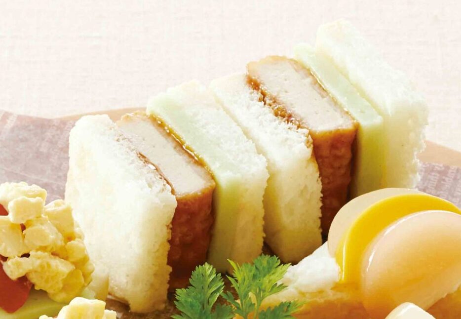 介護食品の『やさしいおかず ポークムースかつ』はユニバーサルデザインフード歯ぐきてつぶせるかたさの介護食品です。