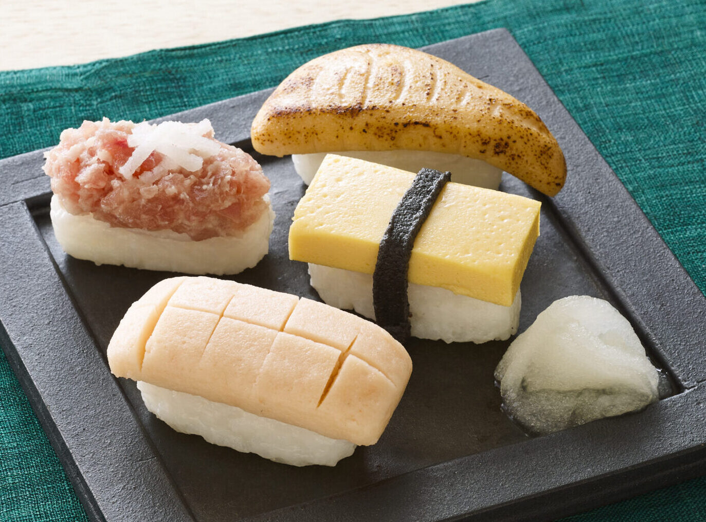 たまごは☆にのせる。温野菜ひじきを薄くカットし、巻き付ける。 - <炙りサーモン>